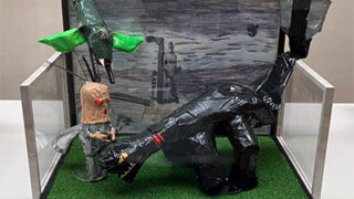 自由度が高すぎて新作は断念し、今回は最近描いた風景画と、以前制作した工作を組み合わせて大型ジオラマに挑戦しました。ベース作りは直前になって100円ショップを駆け回り、材料を買い集めて一気に仕上げたのですが、なんとか完成!ホッとしたのも束の間...