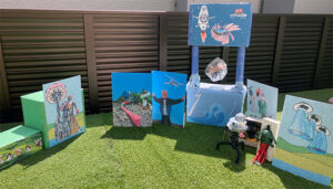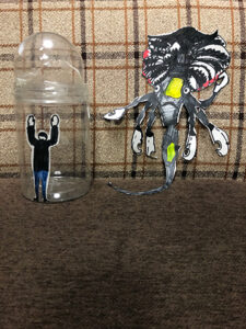 「戦争と平和」をテーマに出展されるとのことで、簡単なストーリーを考え、それに合わせた絵をダンボールやパネルに貼り付け、新作のエイリアンも一緒に出させてもらいました。