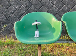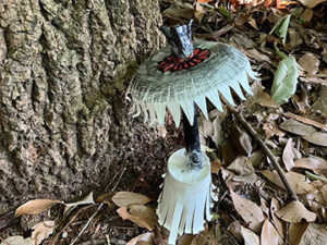 カサの部分は紙皿でベースを作り、周囲のギザギザと頭頂部は画用紙。足のような根の部分は紙コップをカットして作成。茎の部分も黒い画用紙を丸めて傘と根をセロテープで繋いで完成。※ 画像のクリックで原画の掲載ページに移動します。