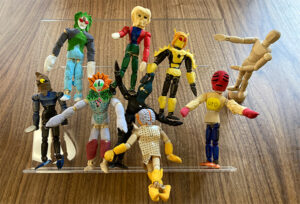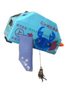 ソフビはかなりの種類を持ってはいますが、店に売られていないものを自作で作りたいとのことで、Fタイガーで販売している人体モデルをベースに、粘土で成形して完成。粘土は色々な色を混ぜたり、インクを足したりして自分で作り出してます。人型ではない宇宙人は紙に描いたものをを切りとって完成。地球人が透明カプセルに閉じ込められてます。