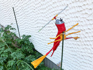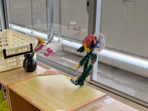 頭から胴体までは紙コップと画用紙で形を作り、赤いビニールテープで最終形を整えています。手足と頭の上にあるヘリコプターのプロペラのようなものはストローの長さを調整しながら、こちらもビニールテープで成形。プロペラは回すことができます。