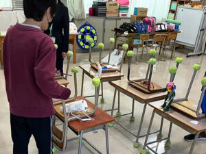 1年生の途中からずっと不登校で、小学校の先生方も大きく変わっている中、工作などを一度見せてほしいとのお声がけをいただき、放課後に教室に展示をさせてもらいました。
