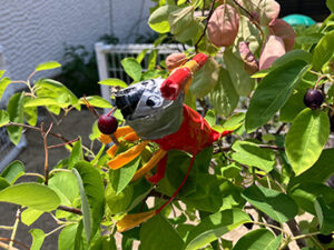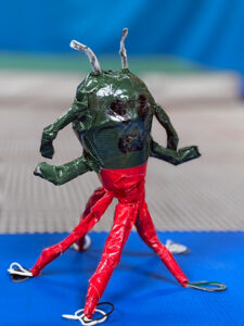 [頭部はガチャポンのケース。骨組みはストローと割り箸。青と赤のガムテで外装を作成。]